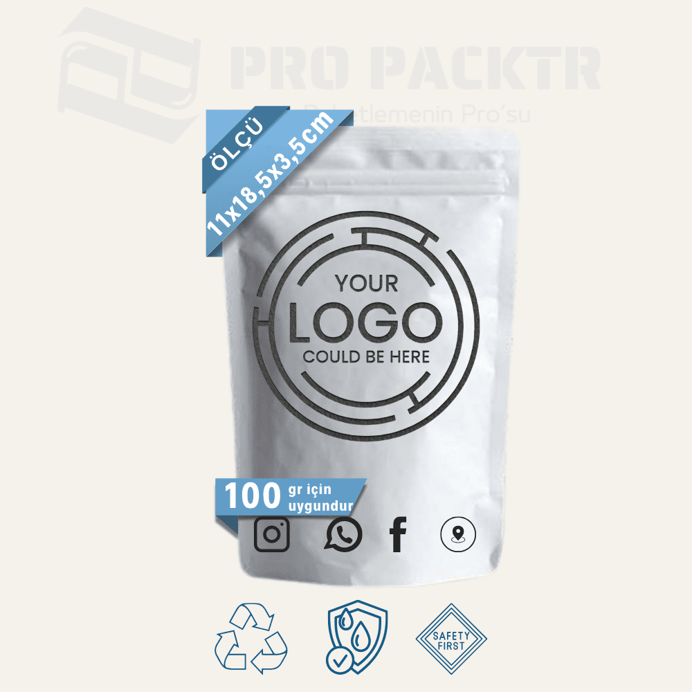 11×18.5×3.5cm Baskılı Mat Alüminyum Doypack | 100 gr. Kapasiteli
