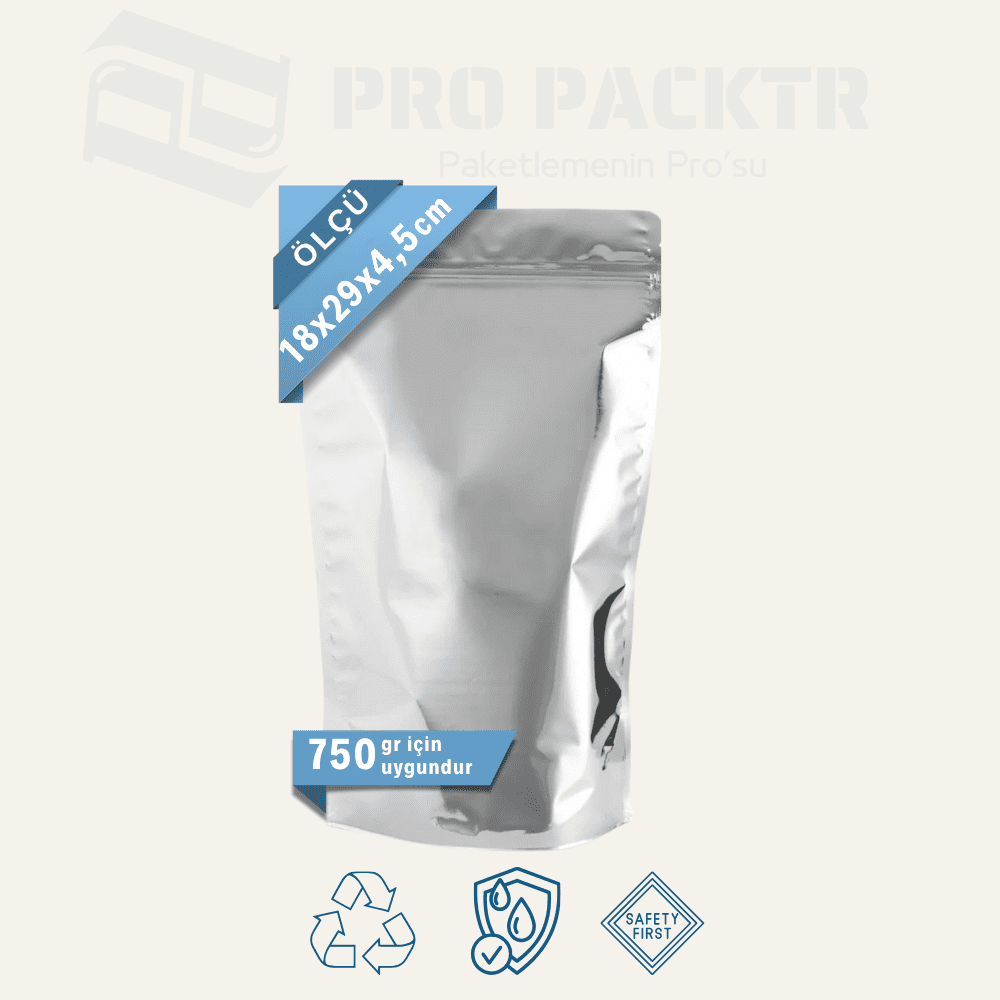 18x29x4.5cm Alüminyum Doypack: 750 gr kapasiteli doypack ambalaj, gıda ve benzeri ürünler için hijyenik, pratik ve estetik bir ambalaj çözümüdür. Kilitli yapısı sayesinde ürünü taze tutar, tekrar açılıp kapanabilir. Dikey duruş özelliği ile raflarda düzen sağlar ve dikkat çeker.
