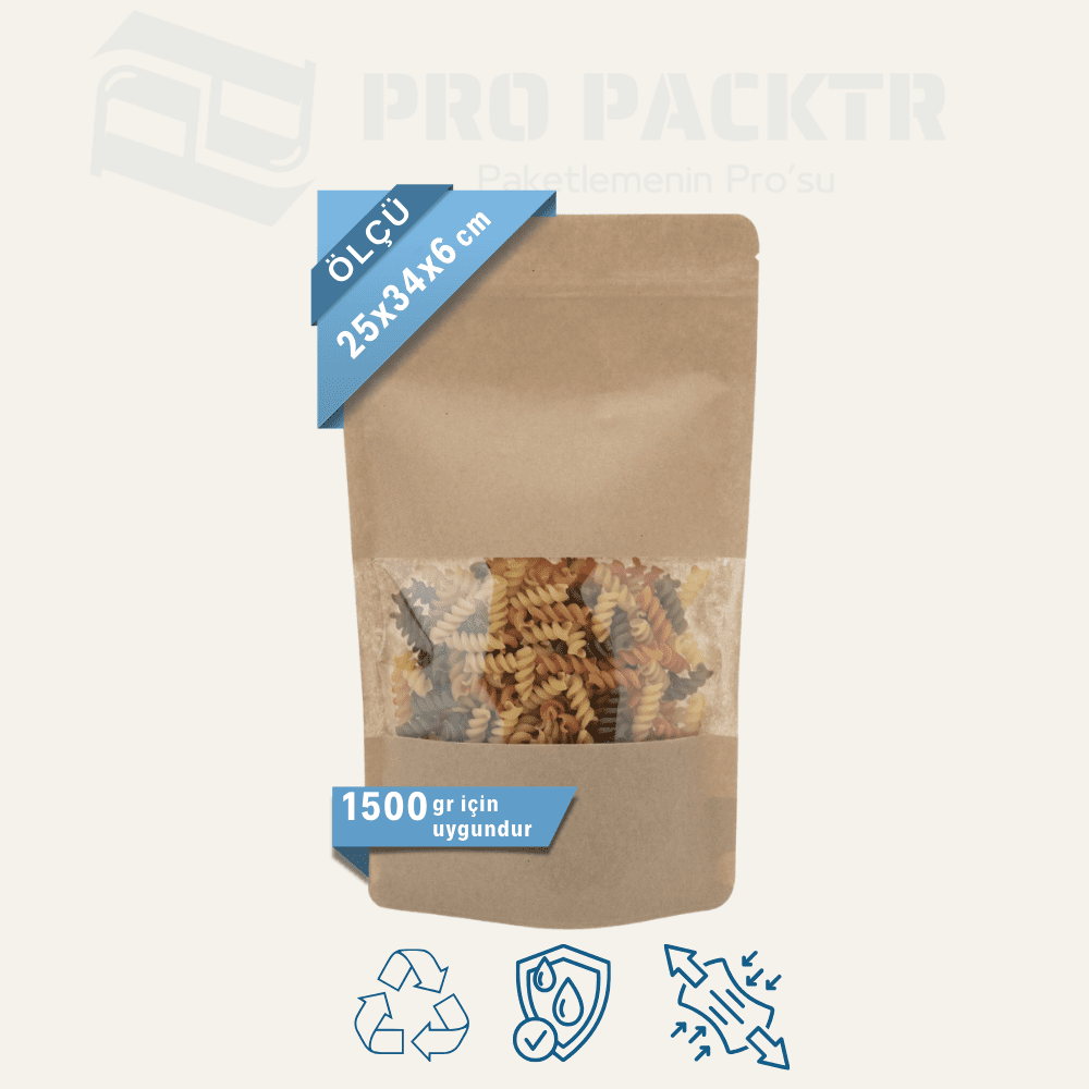 25x34x6cm Kilitli Kraft Pencereli Doypack: 1500 gr kapasiteli doypack ambalaj, gıda ve benzeri ürünler için hijyenik, pratik ve estetik bir ambalaj çözümüdür. Kilitli yapısı sayesinde ürünü taze tutar, tekrar açılıp kapanabilir. kraft pencereli kilitli doypack dikey duruş özelliği ile raflarda düzen sağlar ve dikkat çeker.